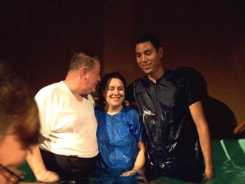 A young couple came to the Revival one evening, Alex and Joni. They said that some stranger had come into the beauty supply where she worked. The lady invited them to come, so they did. One of the members invited them to come and sit with them. Everyone was friendly to this couple and several visited with them awhile after it was over. They were headed for the door, and my Dad wondered if anyone had asked them the question. So he got to them while they were still in the auditorium and asked them the question. This led to a study in the church library there. Dad grabbed a couple from the church to join them in the study. After about an hour, most of the people were gone. I was in the auditorium visiting with some other folks, when they all came in the auditorium and Dad announced that they were going to obey the Gospel. Someone went out to the RV's in the parking lot, and some of the Cadre came back into the building. Dad baptized Alex, then Alex baptized his wife. Dad told me later that it looked like no one had asked them the question, and he didn't want them to leave without having been asked the question. They might have never come back! They are now our brother and sister and are a part of the family. They were so excited, and they said that had no idea when they showed up that all these good things would happen.
